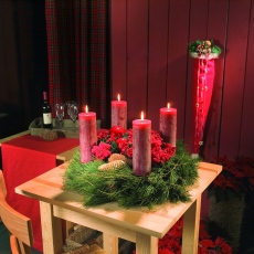 Adventní věnec k Vánocům neodmyslitelně patří. Pokud chcete mít doma adventní věnec zdobený poinsettiemi, můžete si ho jednoduše sami vyrobit. Stačí, když si v některém hobbymarketu koupíte hotový, ale neozdobený přírodní věnec a můžete začít aranžovat. K tomu se hodí především miniaturní rostlinky, které jsou lehce k sehnání. Věnec za pomoci drátku doplňte skleněnými ozdobami, šiškami a samozřejmě čtyřmi svíčkami. Ty by měly být zasazeny do kvalitních držáků, které jim zajistí stabilitu a zabrání vznícení věnce. Vše můžete doplnit zlatým nebo stříbrným provázkem, který lehce omotáte kolem věnce. Tím získá věnec sváteční vzhled. Nejrůznější vánoční dekorace s poinsettiemi vytvoříte i pomocí aranžérské pěny, kterou můžete ozdobit podle vlastní fantazie.