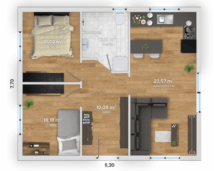 Dům StyleLiving o užitné ploše necelých 60 m² a dispozici 3+kk je prostorný a pohodlný domov pro středně velkou rodinu nebo páry. Nabízí velký obývací pokoj spojený s kuchyňským koutem, dvě samostatné ložnice a koupelnu. Díky své velikosti poskytuje dostatek prostoru pro pohodlné bydlení a soukromí. S moderním designem a praktickým uspořádáním je tento dům ideální pro ty, kteří hledají komfort a prostornost ve svém domově.