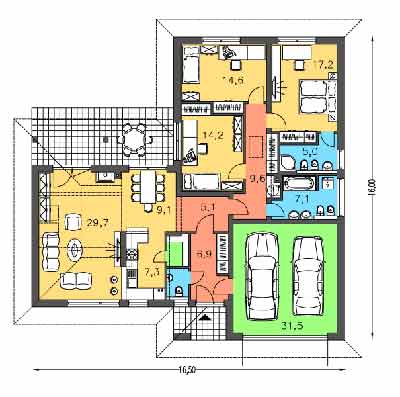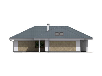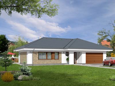 Praktický 4-pokojový přízemní dům s moderním dispozičním řešením a dvojgaráží, určený i pro nejnáročnější klienty, vhodný pro 4-člennou domácnost, na převážně rovinatý terén, po menších úpravách vhodný i pro osobu se sníženou schopností pohybu, přehledné dělení na denní a noční část, noční část je situovaná do tiché zadní části, komfort rodičovské ložnice zvyšuje samostatná koupelna, hlavní obytný prostor tvoří obývací pokoj spojený s jídelnou a kuchyní, s přímým propojením na krytou terasu, nad obývacím pokojem je vynechaná stropní konstrukce, což společně s prosvětlením střešními okny tvoří dojem otevřeného velkoprostoru, část neobytného podkroví je využitelná na skladovací účely, velké plochy obytných místností, cihlový obklad fasády je možné nahradit omítkou nebo jiným typem obkladu.