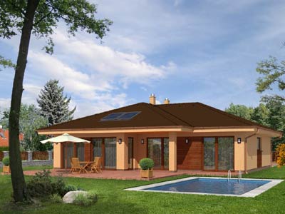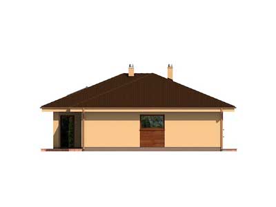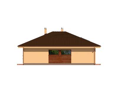 Přízemní dům určený do nízké zástavby na převážně rovinatý terén určený pro 4-člennou rodinu, malá zastavěná plocha, bezbariérové řešení, rozdělená denní a noční část, kompaktní dispozice a malé komunikační prostory, opticky propojený obývací pokoj s krbem, jídelnou a kuchyní, umístění krbu umožňuje vytápění domu, v časti půdy je pochůzný rošt vhodný na skladování, terasu chrání vysunutá střecha, která slouží jako přístřešek i slunolam, místo vestavěné garáže je možné realizovat pokoj, při koupi přistavěné garáže je možné ji propojit jako dvojgaráž, technicky jednoduchá, rychlá a finančně nenáročná realizace je vhodná na svépomocnou výstavbu, kombinace stavebních konstrukcí s nadstandardními tepelně-technickými vlastnostmi je předpokladem minimalizování spotřeby energie na vytápění, projekt možno objednat i s přistavěnou garáží, vyznačenou čárkovaně (v tomto případě je potřebné vyznačit v objednávce název domu „BUNGALOV 874 S GARÁŽÍ“).