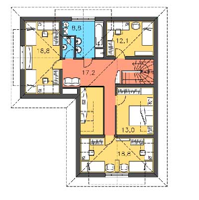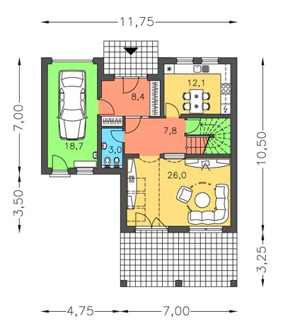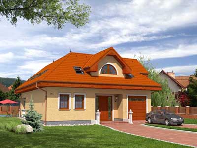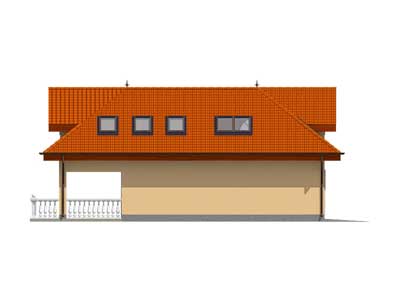 BUNGALOV 94 je dům střední velikostní kategorie • vhodný do dvojpodlažní okolní zástavby na rovinatý nebo mírně svahovitý terén • svými vnitřními prostory uspokojí nároky na bydlení 6 - 7-členné rodiny • přízemí svým dispozičním řešením slouží jako denní část, podkroví jako noční část domu • výhodou objektu jsou plné boční stěny umožňující osadit objekt i na úzké stavební parcely • kladem řešení přízemí objektu je dostatečně prostorná vestavěná garáž s přímým vstupem do rodinného domu a v zadní části s výstupem do exteriéru • obývací pokoj s halou přízemí a halou podkroví tvoří otevřený velkoprostor • v podkroví se nacházejí 4 obytné pokoje, komfortně řešená koupelna a samostatné WC • reprezentativní prvek podkroví tvoří bohatě prosvětlená galerie s průhledem do obývacího pokoje přízemí • po malých technických úpravách je možné krytou terasu přízemí zrealizovat jako zimní zahradu