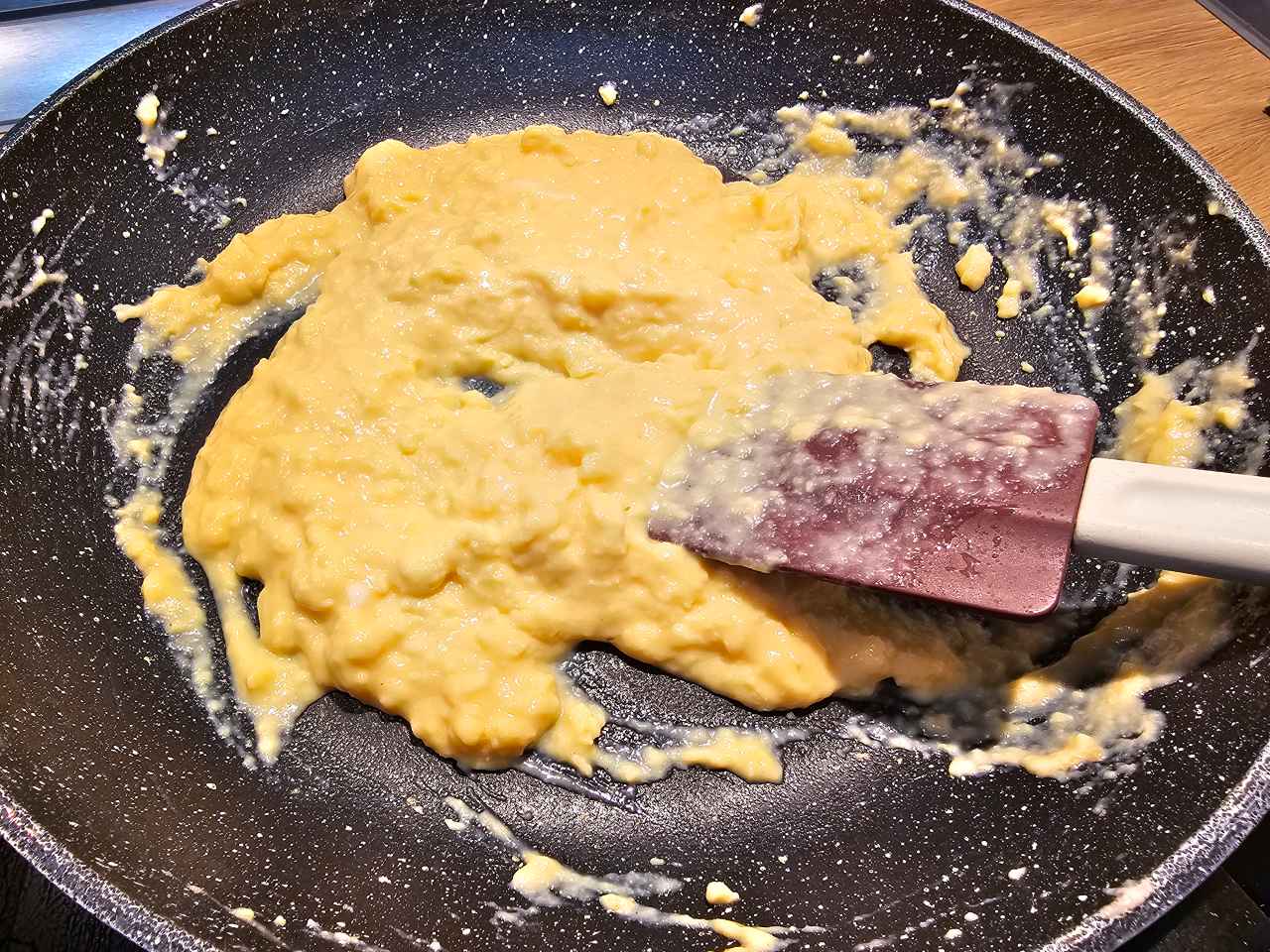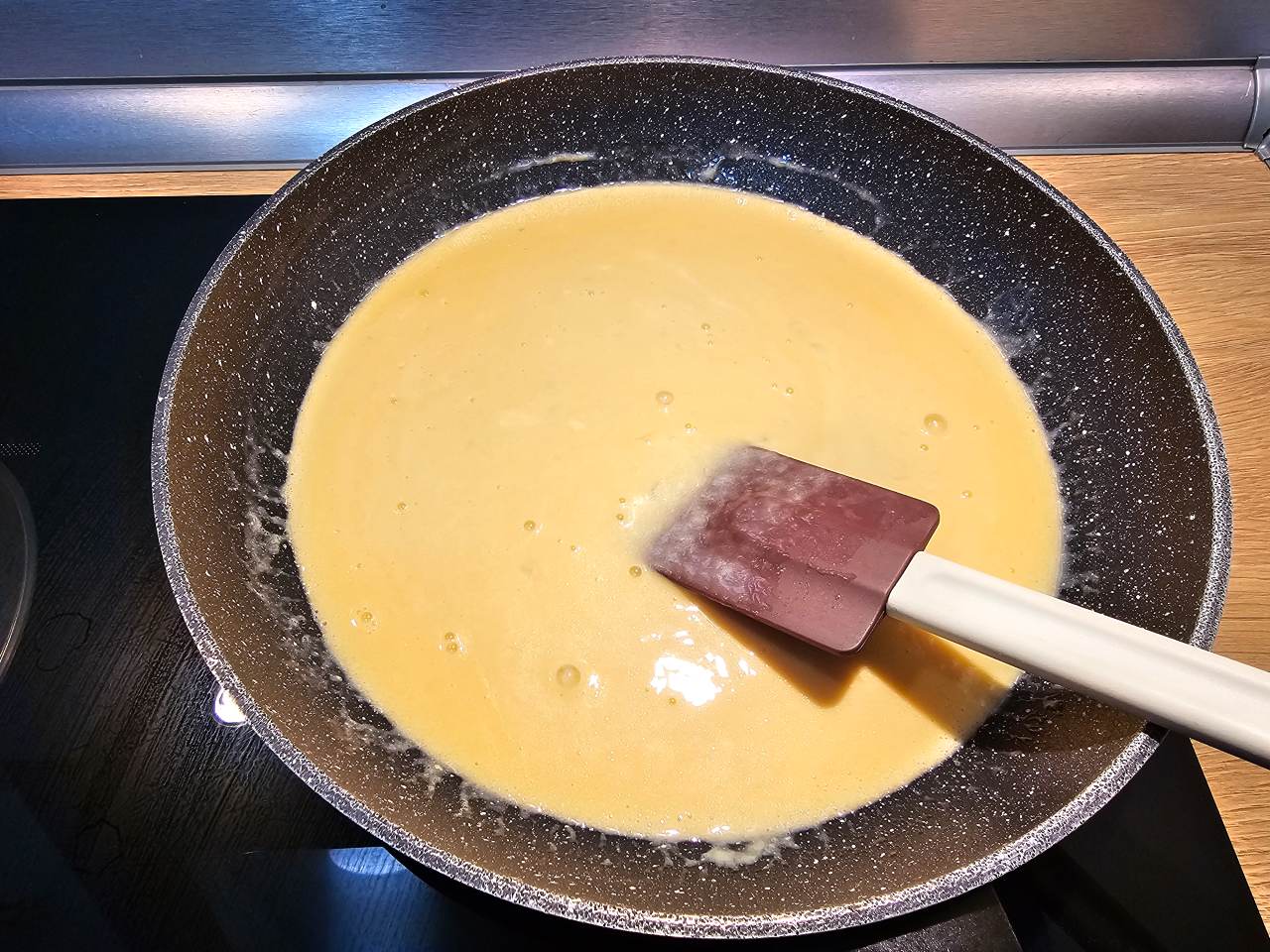 - Pomalu zahřívejte. Na nepřilnavé pánvi rozehřejte máslo na mírném ohni. Jakmile se rozpustí, nalijte vaječnou směs. Pomocí stěrky nebo dřevěné vařečky jemně míchejte směs – ne neustále a urputně, ale spíš roztírejte vejce od krajů ke středu. Pánev nenechávejte na ohni neustále, ale občas ji na chvilku z ohně sejměte. Vejce nesmíte vysušit, chcete krémovou a vláčnou konzistenci.