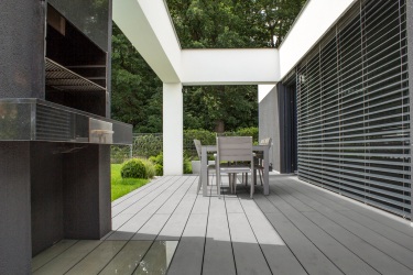 Správnou volbou barevného odstínu terasové podlahy jsou exotické dřeviny nebo ocelové „inox“ barvy. WPC-Woodplastic ze své nabídky doporučuje terasová prkna v provedení wenge, eben, inox a palisander. Struktura těchto prken by měla být hladká, jemně strukturovaná nebo drážkovaná. I když je drážkování výrazné, jedná se o žádoucí efekt, který do minimalistického pojetí vnáší náboj a eleganci. Vše může být umocněno zvolenou šířkou prkna.