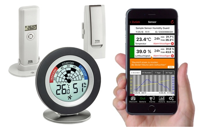 Sada TFA - bezdrátový monitoring vnitřní/venkovní teploty a vlhkosti odkudkoliv a kdykoliv, možnost dokoupení a připojení celkem 50 senzorů (teplota, vlhkost, vítr, srážky, bazénový senzor, dveřní/okenní kontakty), bezplatná aplikace pro iOS a Android, historie měření až 90 dnů, bezdrátová komunikace až na 100m, aplikace Weatherhub.