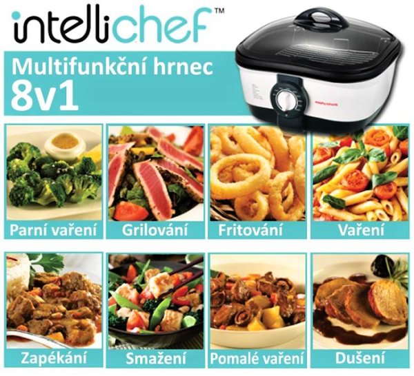 Ve svém těle totiž skloubí hrnec klasický s hrncem parním, gril, fritézu, pánev nebo i pomalý hrnec. Výčet jeho služeb značka Morphy Richards zkracuje do sloganu „intellichef – 8 v 1“.