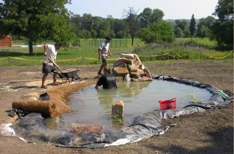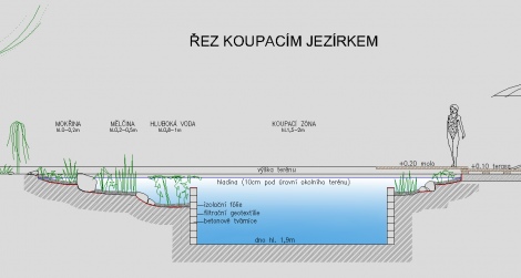Při stavbě jezírka se používá speciální pružná hydroizolační fólie, která je odolná proti UV záření, proti proražení a prorůstání kořenů rostlin. Aby byla nádrž vhodná na koupání, musí být jeho plocha nejméně o velikosti 50 m2. Kromě hluboké části jezírko tvoří i mělká část osázená vodními rostlinami, které tvoří filtrační zónu. Hlubší část je samozřejmě koupací, která může mít hloubku od 150 až 250 cm a délku minimálně 4 až 5 m. Obecně platí: čím větší je jezírko, tím jsou životní podmínky pro rostliny a živočichy příznivější, ale aby mohly ryby bez problémů přezimovat, měla by hloubka jezírka být minimálně osmdesát centimetrů a při chovu kaprů až metr osmdesát.
