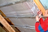 4. Po dokončení aplikace první vrstvy izolace připevníme na krokve z interiéru parozábranu, která se musí neprodyšně slepit.