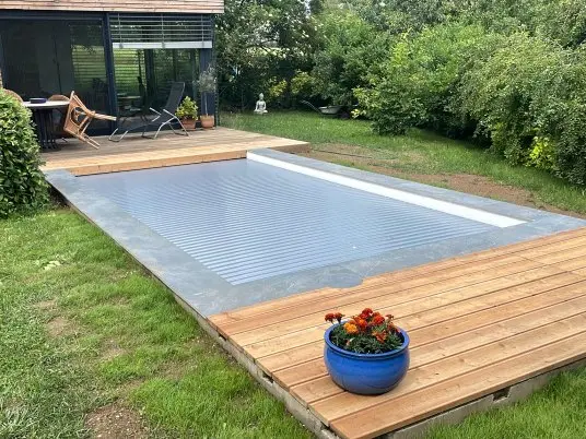 Lamelové zakrytí Safe Pool zvyšuje bezpečnost, udržuje vodu čistou a teplou.