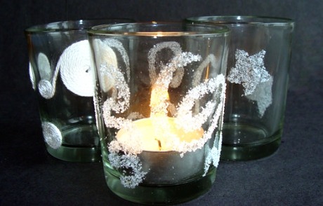 Postup na výrobu vánočního svícnu je velmi jednoduchý. Do papírové šablony vystřihneme nějaký vánoční motiv, například hvězdičku. Tuto šablonu přiložíme na sklenici a v místě, kde se náš vystřižený motiv nachází, potřeme odhalené sklo lepidlem. Sklenici s přiloženou šablonou pak obalíme v cukru a necháme zaschnout. Jakmile lepidlo zaschne, pomalu odstraníme papírovou šablonu a můžeme se radovat z krásného obrázku. Do skleničky můžeme vložit klasickou čajovou svíčku a vytvoříme si tak úžasnou atmosféru Vánoc.