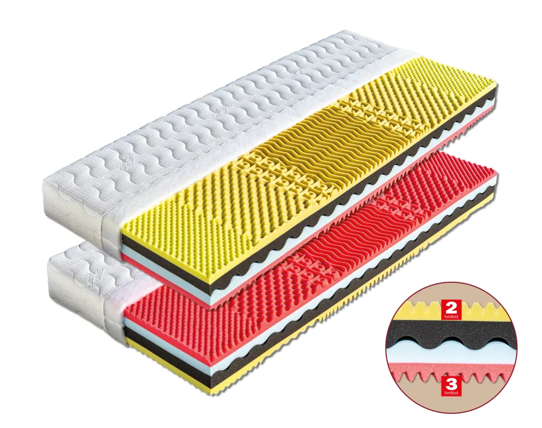 Matrace, jejíž jádro tvoří 12 cm vysoká vrstva speciální červené antibakteriální pěny (32 kg/m³) značky Sanitized, která poskytuje trvalou a účinnou ochranu proti bakteriím, roztočům a plísním. Tyto vlastnosti ocení nejen alergici, ale i ti, kteří kladou důraz na vysokou hygienu lůžka. Je navržena se zářezy ve tvaru „Y“, které napomáhají odlehčení v místech největšího zatížení - oblast ramen. Vrchní stranu matrace změkčuje oblíbená viscoelastická pěna (50 kg/m³). Je charakteristická efektem pomalého vracení se do původní polohy. Pouhým přetočením matrace získáte pevnější stranu se vzdušnou a elastickou studenou HR pěnou (40 kg/m³), která má antidekubitní prořezy v pěti zónách. Dokonale se přizpůsobí ležícímu tělu a zamezuje vzniku proleženin. Matrace je vhodná na všechny typy roštů, včetně motorových.