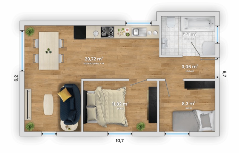 Dům EasyLiving s užitnou plochou 58 m² a dispozicí 3+kk nabízí útulné a pohodlné bydlení pro páry či malou rodinu. Interiér zahrnuje prostorný obývací pokoj s kuchyňským koutem, dvě samostatné ložnice a koupelnu. Díky svému praktickému uspořádání a modernímu designu poskytuje dostatek prostoru pro pohodlný život a soukromí. Tento dům je ideální volbou pro ty, kteří hledají kompaktní a funkční domov pro svou rodinu.