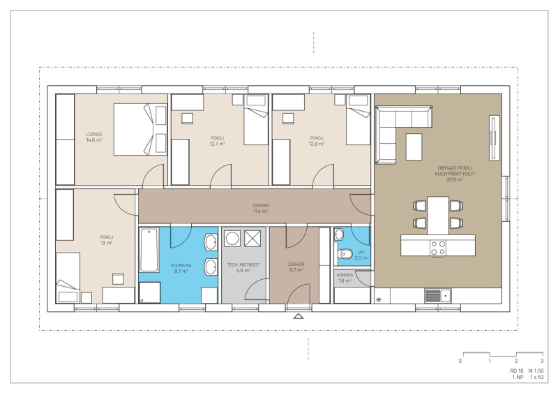 Dům je ideálním řešením pro rodiny s více dětmi nebo pokud potřebujete samostatnou pracovnu či hostinský pokoj. To vše vám náš bungalov nabízí. Je zde oddělena klidová část domu s ložnicí a pokoji od části s technickým a sociálním zázemím, kterému dominuje prostorná koupelna, technická místnost a samostatné WC. Do domu se vchází přes zádveří, v kterém pohodlně umístíte botník i skříň na svršky oděvu. A velmi podstatnou částí domu, kde se potkává celá rodina, je prostorný obývací pokoj s jídelním a kuchyňským koutem, který je doplněn místností spíže.
