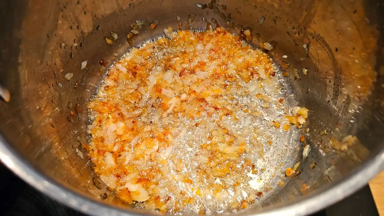 3. Přidáme nasekaný česnek, sladkou papriku a krátce orestujeme, aby paprika nezhořkla.