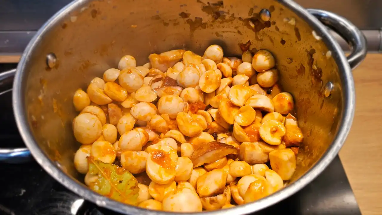 5. Zalijeme vývarem a necháme dusit na mírném ohni asi 20 minut, dokud houby nezměknou.