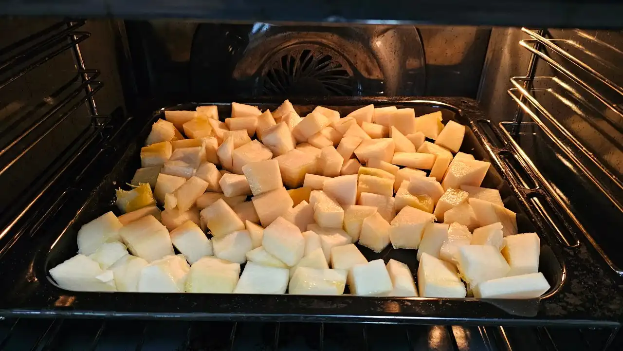 Předehřejte troubu na 200°C (180°C s ventilátorem). Dýni promíchejte s 1 lžící oleje, osolte a rozložte na plech. Pečte 30 minut, dokud není měkká a zlatavá.