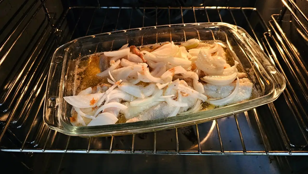 Posypeme cibulí a umístěme do předehřáté trouby.