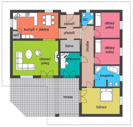 Typový rodinný dům IRIDA z nabídky chrudimské firmy Hoffmann patří svým tvarem ke klasickým bungalowům s téměř univerzální možností výstavby. Může stát jak v nové zástavbě na vesnici, tak v příměstské či centrální části města. Vždy bude zajímavou stavbou postavenou na jednoduchém půdorysu tvaru písmena L, se zastavěnou plochou 194,03 m2 a s prostornou, částečně zastřešenou terasou vhodnou k relaxaci po namáhavém pracovním dni. Dům byl navržen, aby splňoval nároky pohodlného bydlení pro 4-5 člennou rodinu včetně občasného přespání návštěv. Součástí domu není garáž. S tou se počítá spíše jako se samostatně stojící, častým řešením bývá i realizace dvou krytých stání se začleněním místnosti pro uložení nezbytného nářadí či sportovního vybavení včetně jízdních kol.